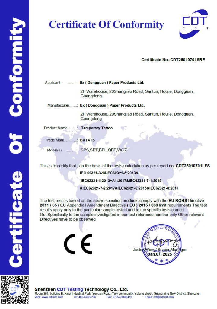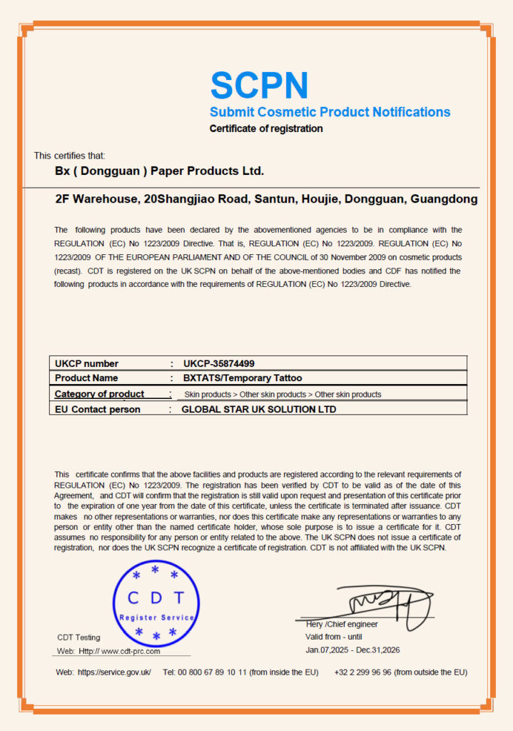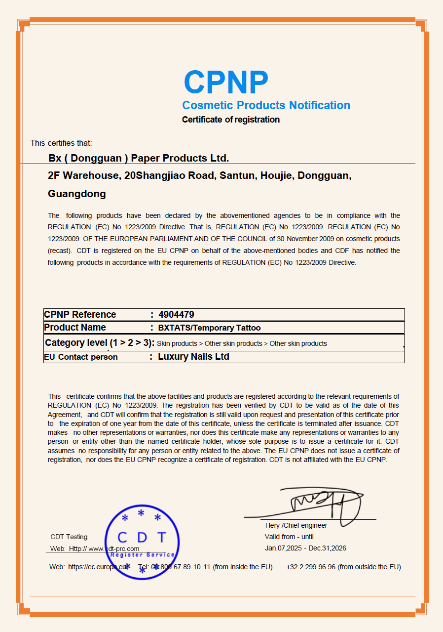 A JaguaTattoo termékeink kizárólag megbízható forrásból származó, ellenőrzött összetevőkből készülnek. Az értékesített JahuaTattoo-k gyártója minden szükséges biztonsági és minőségi engedéllyel rendelkezik, amelyeket ezen az oldalon alább meg is tekinthetsz. Ezek az engedélyek igazolják, hogy a termék megfelel az egészségügyi előírásoknak, és biztonsággal használható testfestésre.